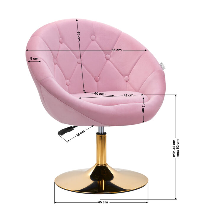 Luksusowe wykończenie sprawia, że mebel wpada w oko. Przyjemne w dotyku, welwetowe obicie w odcieniach różu wraz z ozdobnym pikowaniem nadają mu wyjątkowego charakteru. Stabilna, okrągła podstawa w odcieniach złota dodaje elegancji, idealnie komponując się z welwetem. Estetyka wykonania, komfort użytkowania, ergonomicznie wyprofilowane oparcie i estetyczne pikowanie sprawiają, że krzesło spełni wymagania nawet najbardziej wymagających użytkowników.