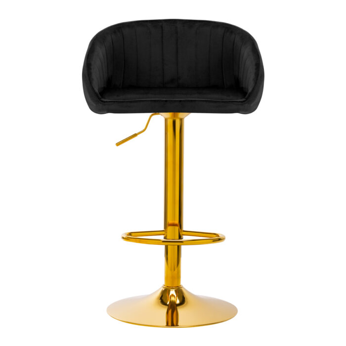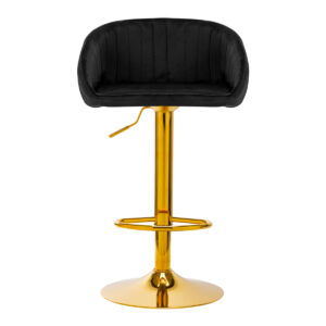 Hoker wyróżnia się przyjemnym w dotyku, welwetowym obiciem w odcieniach czerni, które nadaje mu ekskluzywny charakter. Stylowe przeszycia na oparciu hokera podkreślają elegancki wygląd i staranne wykonanie. Okrągła podstawa z antypoślizgową gumą zapewnia stabilność, a złoty kolor harmonizuje z welwetowym obiciem, nadając meblowi wyrafinowany styl. Ergonomicznie wyprofilowane siedzisko oraz regulowana wysokość sprawiają, że hoker jest idealnym wyborem dla osób ceniących sobie styl oraz wygodę.