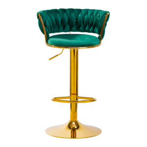 Przyjemne w dotyku, welwetowe obicie w odcieniach zieleni nadaje hokerowi wyjątkowego charakteru, a estetycznie przeplatany materiał na oparciu podkreśla unikatowy wygląd mebla. Wykończenie sprawia, że mebel zapadnie w oko. Stelaż w odcieniach złota dodaje elegancji i prestiżu, idealnie komponując się z aksamitem.