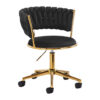 Wykończenie sprawia, że mebel wpada w oko. Przyjemne w dotyku, welwetowe obicie w odcieniach czerni nadaje mu wyjątkowego charakteru. Podstawa w odcieniach złota dodaje elegancji, idealnie komponując się z welwetem. Funkcjonalne koła zapewniają mobilność, ułatwiając przestawianie krzesła oraz poruszanie się po salonie w trakcie pracy. Staranność wykonania, komfort użytkowania oraz estetycznie przeplatany materiał na wyprofilowanym oparciu sprawiają, że krzesło spełni wymagania nawet najbardziej wymagających użytkowników.