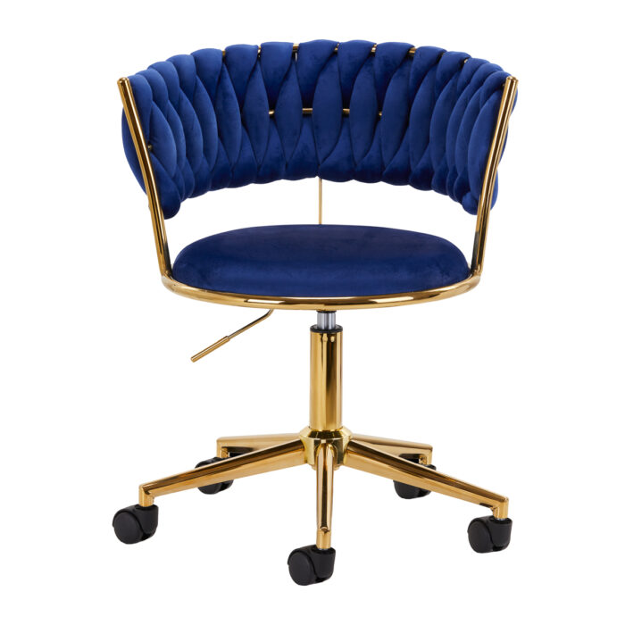 Wykończenie sprawia, że mebel wpada w oko. Przyjemne w dotyku, welwetowe obicie w odcieniach granatu nadaje mu wyjątkowego charakteru. Podstawa w odcieniach złota dodaje elegancji, idealnie komponując się z welwetem. Funkcjonalne koła zapewniają mobilność, ułatwiając przestawianie krzesła oraz poruszanie się po salonie w trakcie pracy. Staranność wykonania, komfort użytkowania oraz estetycznie przeplatany materiał na wyprofilowanym oparciu sprawiają, że krzesło spełni wymagania nawet najbardziej wymagających użytkowników.