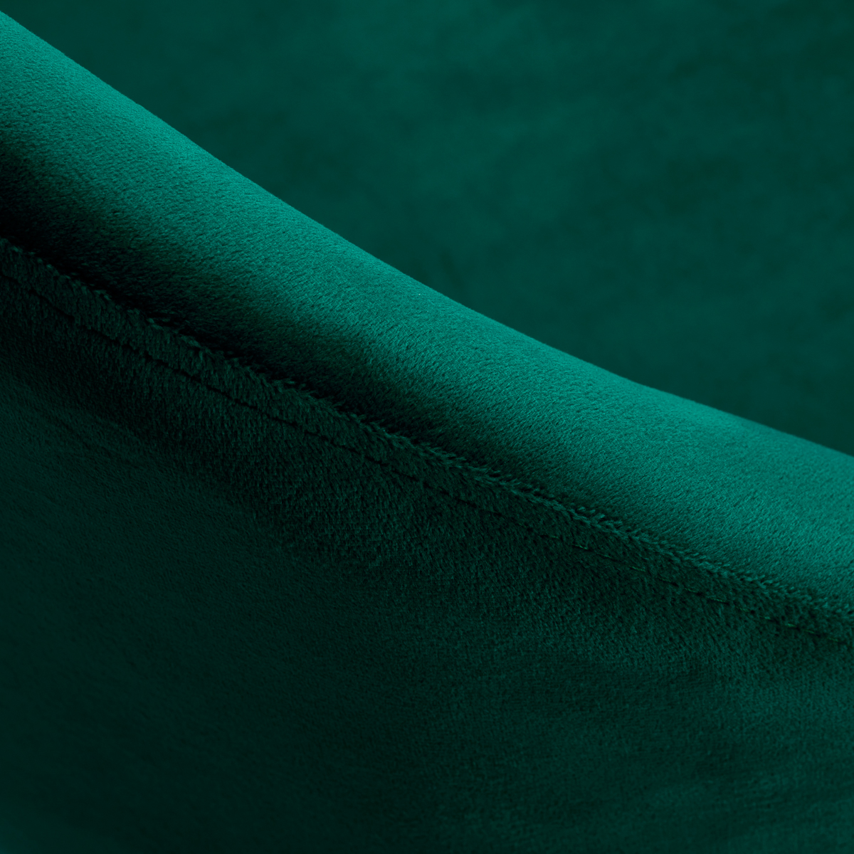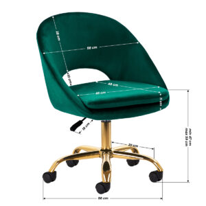 Proste wykończenie sprawia, że mebel wpada w oko. Przyjemne w dotyku, welwetowe obicie w odcieniach zieleni nadaje mu wyjątkowego charakteru. Podstawa w odcieniach złota dodaje elegancji, idealnie komponując się z welwetem, a funkcjonalne koła zapewniają mobilność, ułatwiając przestawianie krzesła oraz poruszanie się po salonie w trakcie pracy. Estetyka wykonania, komfort użytkowania oraz ergonomicznie wyprofilowane oparcie sprawiają, że krzesło spełni wymagania nawet najbardziej wymagających użytkowników.