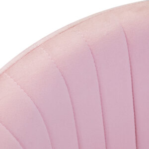 Staranne wykończenie sprawia, że mebel wpada w oko. Przyjemne w dotyku, welwetowe obicie w odcieniach różu nadaje mu wyjątkowego charakteru. Podstawa w odcieniach złota dodaje elegancji, idealnie komponując się z welwetem, a funkcjonalne koła zapewniają mobilność, ułatwiając przestawianie krzesła oraz poruszanie się po salonie w trakcie pracy. Estetyka wykonania, komfort użytkowania, ozdobne przeszycia oraz ergonomicznie wyprofilowane oparcie sprawiają, że krzesło spełni wymagania nawet najbardziej wymagających użytkowników.