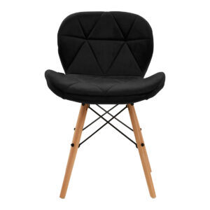 Siedzisko pokryte jest tapicerką z przyjemnego w dotyku welwetu w odcieniach czerni. Nadaje mu to ekskluzywny wygląd i zapewnia komfort użytkowania. Staranne przeszycia w geometrycznych kształtach stanowią elegancki sznyt, a łączący nogi metalowy stelaż w odcieniach czerni dodaje meblowi stabilności. Drewniane, matowo wykończone nóżki zakończono plastikowymi zabezpieczeniami, dodatkowo chroniącymi przed przypadkowym uszkodzeniem. Krzesło w stylu skandynawskim jest komfortowym meblem, który stanie się ozdobą recepcji każdego salonu kosmetycznego.