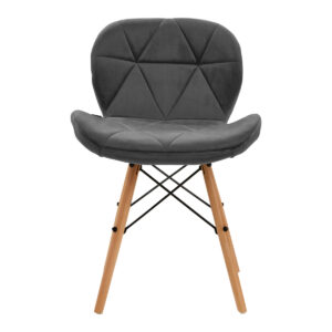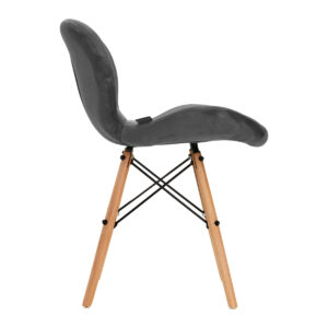 Siedzisko pokryte jest tapicerką z przyjemnego w dotyku welwetu w odcieniach szarości. Nadaje mu to ekskluzywny wygląd i zapewnia komfort użytkowania. Staranne przeszycia w geometrycznych kształtach stanowią elegancki sznyt, a łączący nogi metalowy stelaż w odcieniach czerni dodaje meblowi stabilności. Drewniane, matowo wykończone nóżki zakończono plastikowymi zabezpieczeniami, dodatkowo chroniącymi przed przypadkowym uszkodzeniem. Krzesło w stylu skandynawskim jest komfortowym meblem, który stanie się ozdobą recepcji każdego salonu kosmetycznego.