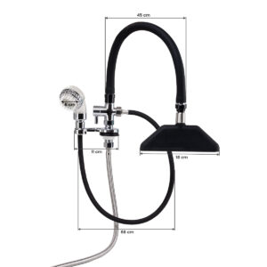 Bateria wodospad Gabbiano dostępna jest w eleganckim wykończeniu w odcieniach czerni i chromu. Jej stylowy wygląd idealnie komponuje się z nowoczesnymi wnętrzami salonów fryzjerskich. Standardowy rozmiar umożliwia łatwy montaż przy misie umywalki fryzjerskiej i jest kompatybilny z większością modeli dostępnych na rynku.