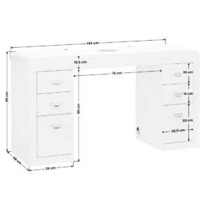 Szafki po obu stronach z trzema pojemnymi szufladami znacznie ułatwiają organizację oraz utrzymanie porządku w najpotrzebniejszych kosmetykach i narzędziach. Dzięki temu niezbędne produkty zawsze znajdują się pod ręką, co przekłada się na efektywność pracy. Biurko ma specjalne otwory w blacie do przeprowadzania kabli od niezbędnych urządzeń, co pozwala na łatwe utrzymanie porządku i estetyki stanowiska pracy.