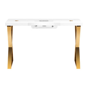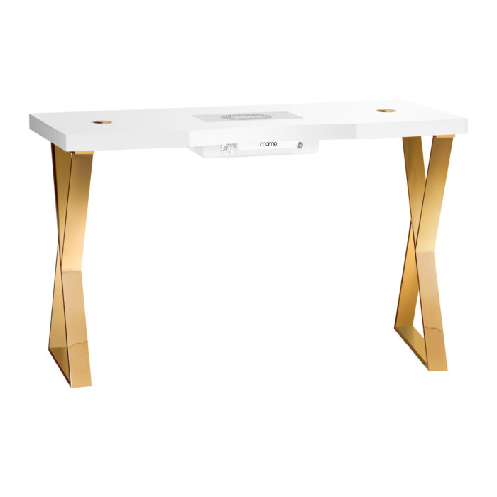 Biały blat na wysoki połysk oraz geometryczne, złote nogi nadają mu lekkości i nowoczesnego charakteru. Dzięki swojej lekkiej formie biurko sprawdzi się zarówno w kameralnych, jak i przestronnych wnętrzach, podkreślając ich ekskluzywny charakter. To doskonała inwestycja w estetykę oraz komfort codziennej pracy.