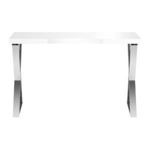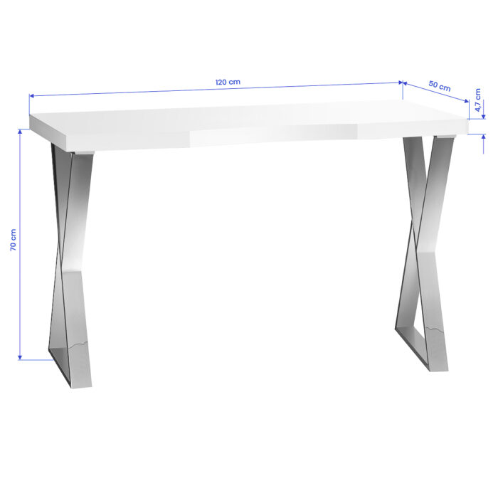 Biały blat na wysoki połysk oraz geometryczne, srebrne nogi nadają mu lekkości i nowoczesnego charakteru. Dzięki swojej lekkiej formie biurko sprawdzi się zarówno w kameralnych, jak i przestronnych wnętrzach, podkreślając ich ekskluzywny charakter. To doskonała inwestycja w estetykę oraz komfort codziennej pracy.