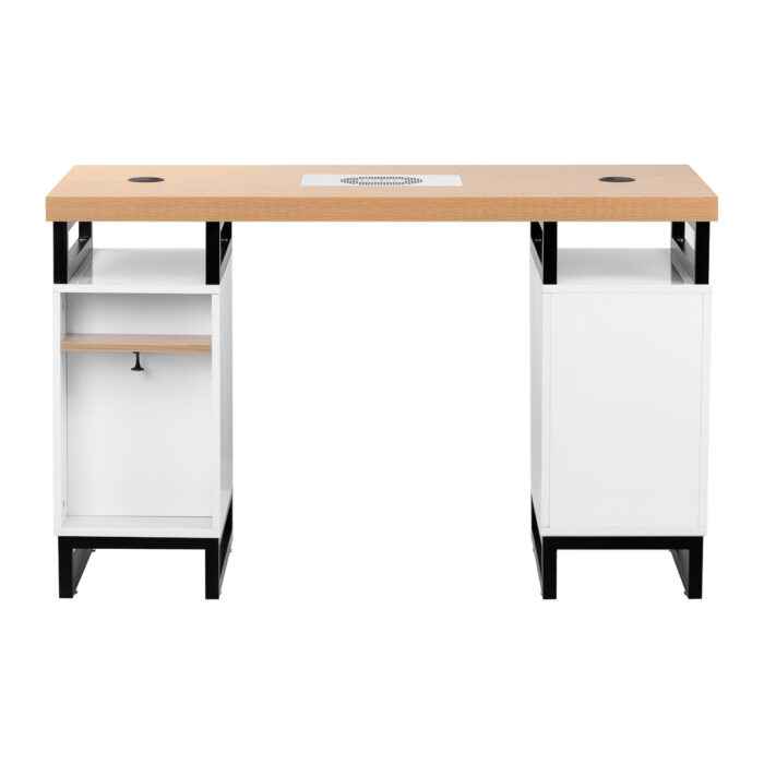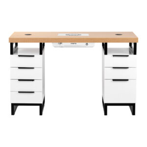 Biurko wyposażone jest w dwie funkcjonalne szafki z pojemnymi szufladami – po lewej stronie znajdują się cztery, a po prawej dwie i jedna większa, idealna na duże akcesoria czy urządzenia. Taki układ ułatwia utrzymanie porządku i szybki dostęp do niezbędnych narzędzi. Otwarte półki nad szufladami sprawdzą się doskonale jako miejsce na urządzenia lub najczęściej używane przybory. Specjalne przelotki i otwory na kable pozwalają estetycznie poprowadzić przewody, co podnosi komfort pracy i sprzyja zachowaniu porządku na stanowisku. Z tyłu biurka znajduje się praktyczny wieszaczek i niewielka półka do dyspozycji klientów.