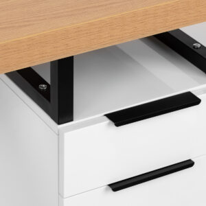 Połączenie blatu w odcieniach drewna z białymi frontami oraz czarnymi elementami ramy i uchwytami tworzy nowoczesny, a zarazem profesjonalny wygląd. Kontrast między białymi szafkami, drewnianym blatem i czarną, metalową ramą nadaje biurku elegancki, współczesny charakter. Stabilna metalowa podstawa zapewnia trwałość oraz komfort, nawet podczas wielogodzinnej pracy. To doskonały wybór zarówno do mniejszych salonów, jak i przestronnych gabinetów z nowoczesnym wystrojem.