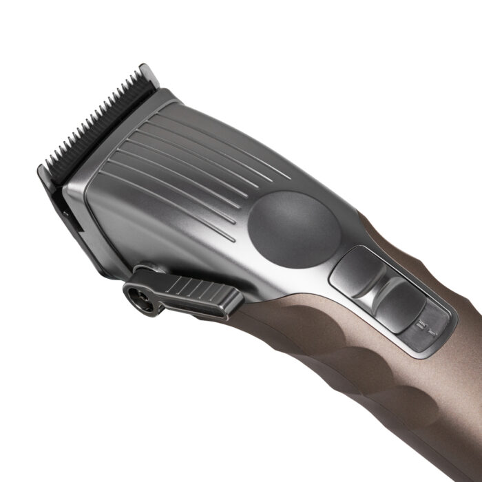 Maszynka o nowoczesnym, ergonomicznym kształcie została wykonana z matowego tworzywa sztucznego w odcieniach tytanu, co zapewnia trwałość i ułatwia utrzymanie jej w czystości. Stylowy, polerowany panel dodaje urządzeniu elegancji, a intuicyjnie rozmieszczony suwak i dźwignia, idealnie dopasowane do naturalnego ułożenia palców, gwarantują wygodę obsługi. Wgłębienia w obudowie nie tylko podkreślają estetyczny wygląd maszynki, ale także zapewniają pewny chwyt, minimalizując ryzyko ślizgania się urządzenia w dłoni i umożliwiając precyzyjne strzyżenie.