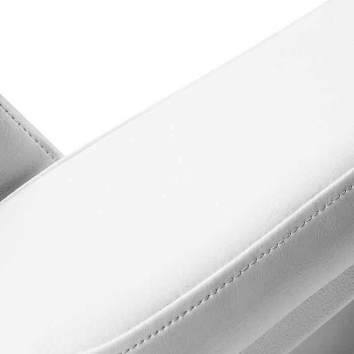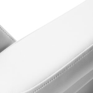 Fotel wypełniony jest odporną na odkształcenia pianką i pokryty przyjemną w dotyku imitacją skóry w odcieniu bieli. Zastosowanie tego materiału sprawia, że sprzęt jest odporny na wilgoć i łatwy do utrzymania w czystości. Starannie wykonane przeszycia dodają mu stylu, a solidna konstrukcja zapewnia stabilność oraz długotrwałe użytkowanie. Minimalistyczny design i klasyczna kolorystyka sprawiają, że idealnie komponuje się z każdym wnętrzem.