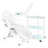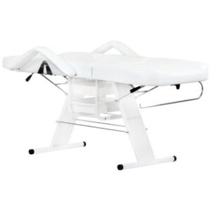 Fotel z otworem w zagłówku, z praktycznymi kuwetami, doskonale sprawdza się w kosmetyce, wizażu i masażu. Posiada wyjmowane podłokietniki i zaślepkę w zagłówku. Poszycie fotela łatwo zmywalne, wykonane z eko-skóry, spełniające rygorystyczne wymogi UE, estetyczne, niklowane elementy metalowe. Na oparciu zamontowany jest pałąk na prześcieradło jednorazowe, serwety lub ręcznik.