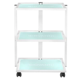 z gumowanymi kółkami. Posiada trzy szklane półki z grawerowanym logo GIOVANNI. Istnieje możliwość przymocowania do niego lampy-lupy.