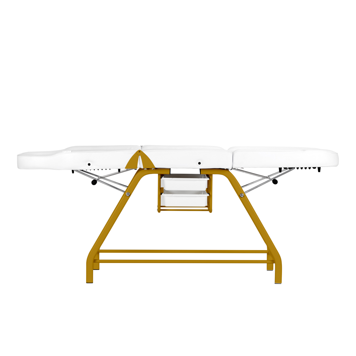 Praktyczne kuwety z tworzywa sztucznego umieszczone pod siedziskiem zapewniają łatwy dostęp do najpotrzebniejszych przyrządów. Wysuwane pojemniki są trwałe i łatwe w czyszczeniu, a dodatkowo pomagają utrzymać porządek na stanowisku pracy. Dzięki otworowi w zagłówku, który jest ukryty pod odpowiednio wyprofilowaną poduszką, fotel doskonale sprawdzi się przy zabiegach przeprowadzanych na plecach, takich jak masaże.