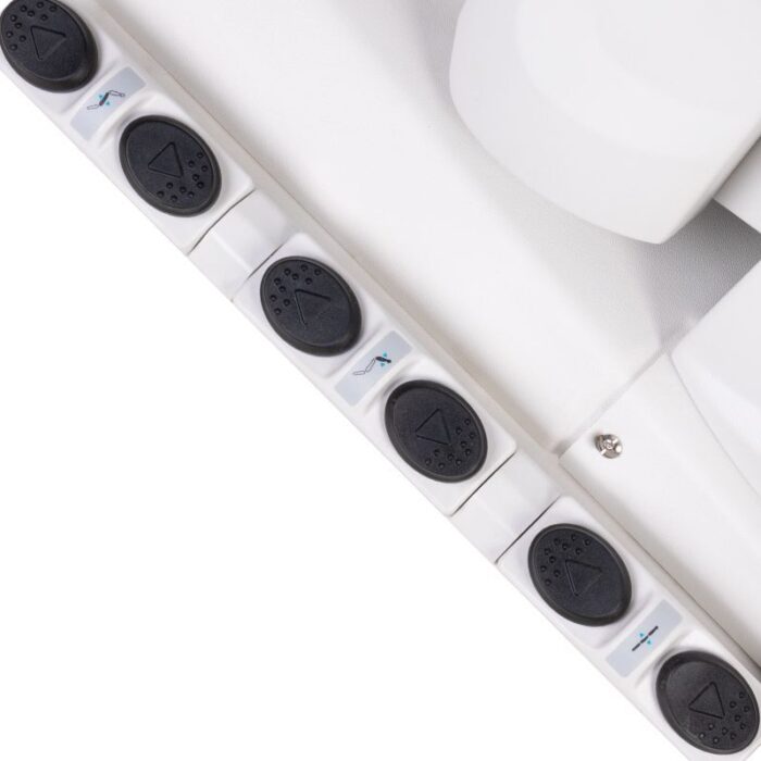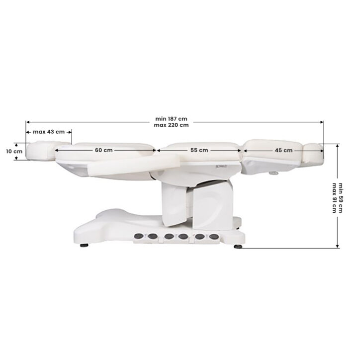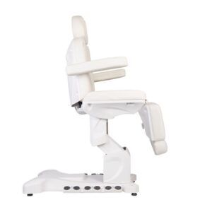 Wyjątkowy fotel kosmetyczny elektryczny idealnie nadający się do gabinetów kosmetycznych oraz salonów SPA. Dzięki niezależnym silnikom umożliwia regulację fotela w 3 płaszczyznach za pomocą pilota i przełaczników nożnych dając możliwość komfortowego przeprowadzenia zabiegów na twarz oraz ciało. Używając pilota możemy korzystać z zaprogramowanych ustawień oraz uruchamiać funkcję HOT czyli podgrzewanie oraz pompowanie oparcia. W fotelu została zastosowana tapicerka perforowana niespotykana w innych fotelach oraz kolorowe podswietlenie LED podstawy.