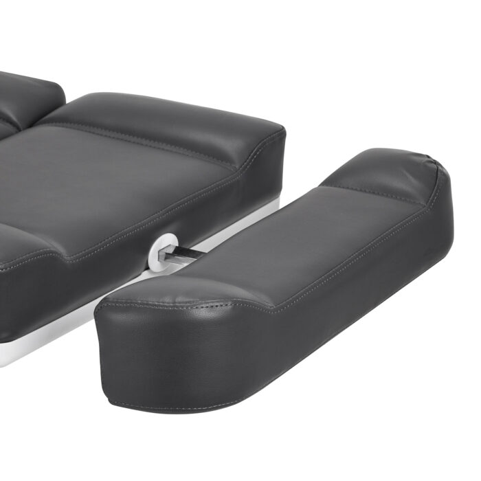 Otwór w zagłówku świetnie sprawdzi się w trakcie usług, podczas których klient zostaje ułożony głową w dół (np. masaże). W zestawie znajdują się zaślepka na otwór w zagłówku oraz wygodna poduszka, które ułatwiają przeprowadzanie szerokiej palety zabiegów zarówno na twarz, jak i ciało. Podłokietniki są ruchome, można je ustawić w pozycji pionowej lub przełożyć o 180º, a także łatwo demontowalne, co ułatwia bezpośredni dostęp do klienta.