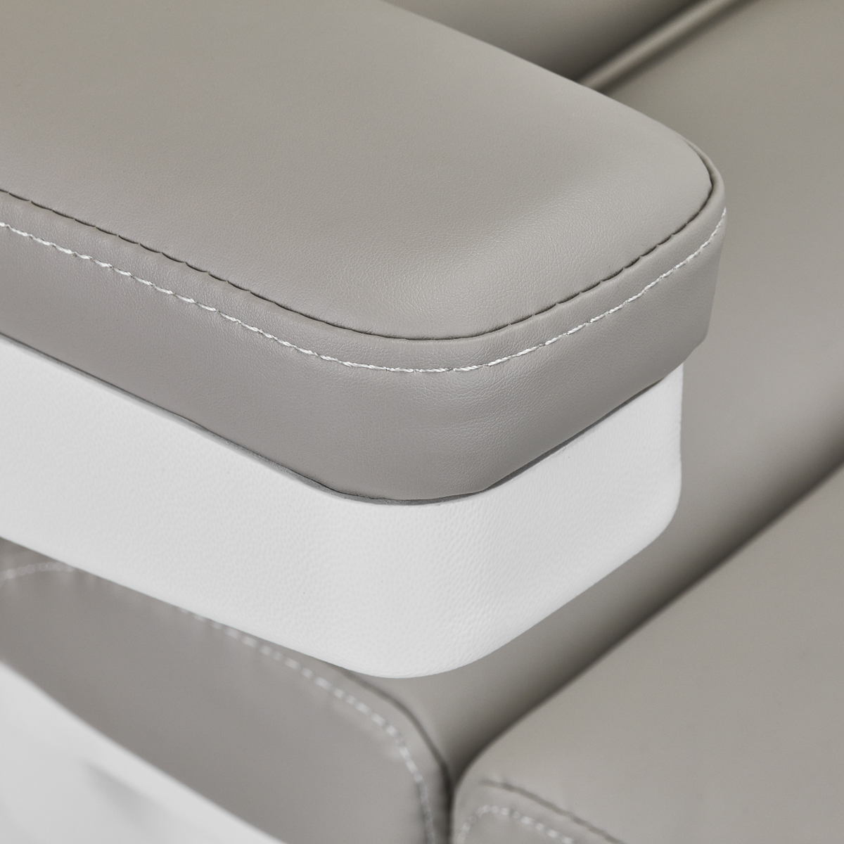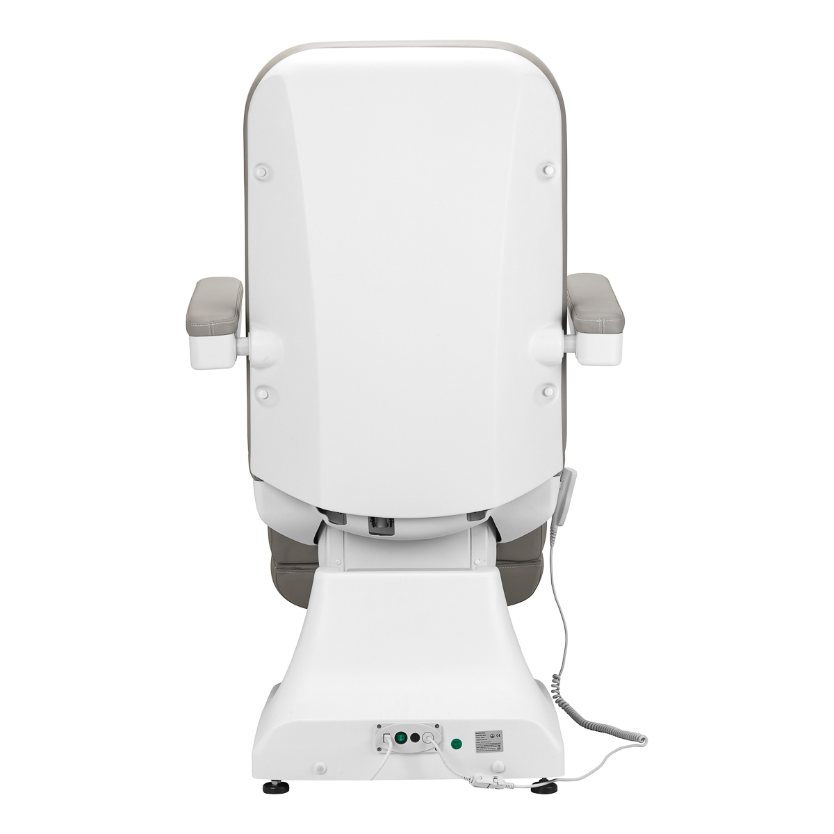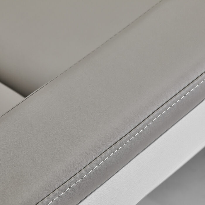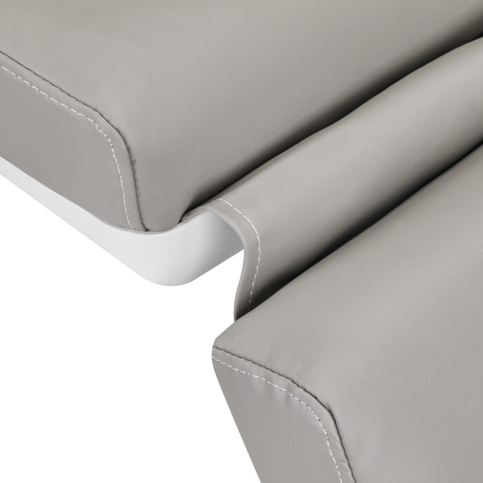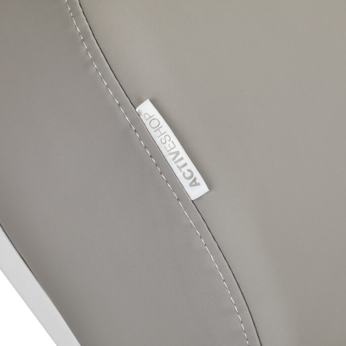 Fotel wypełniony jest pianką o odpowiedniej twardości oraz pokryty przyjemną w dotyku imitacją skóry w odcieniach szarości. Dzięki użyciu materiału, który jest łatwy do utrzymania w czystości oraz odporny na wybrane środki dezynfekcji, sprzęt jest komfortowy w użytkowaniu, wytrzymały na wilgoć oraz nieskomplikowany w czyszczeniu. Solidna podstawa wykonana z trwałego materiału w odcieniach bieli zapewnia stabilność w trakcie zabiegów. Odpowiednio wyprofilowane obszycia nadają fotelowi stylowy wygląd i sprawiają, że siedzisko jest ergonomiczne.