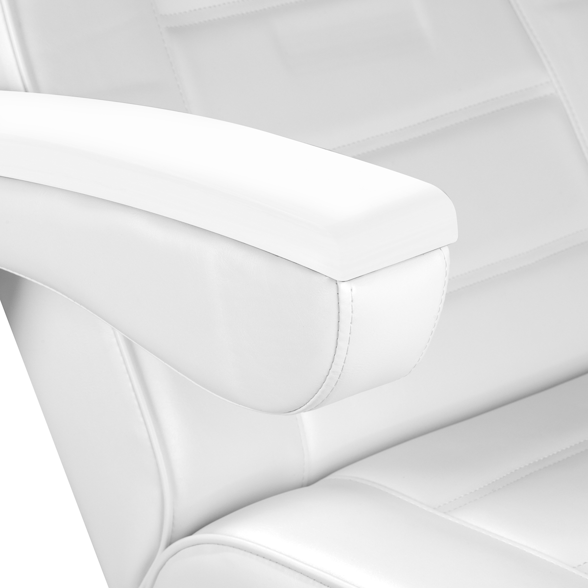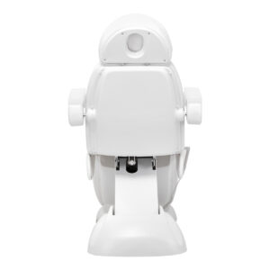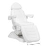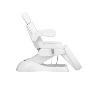 Fotel wypełniony jest pianką o odpowiedniej twardości, a jego powierzchnia pokryta jest przyjemną w dotyku imitacją skóry w odcieniach bieli. Materiał, z którego wykonano pokrycie, jest łatwy do utrzymania w czystości oraz odporny na wybrane środki dezynfekcyjne, co gwarantuje komfort użytkowania i trwałość na wilgoć. Solidna podstawa wykonana z trwałego materiału w odcieniach bieli zapewnia stabilność w trakcie zabiegów. Starannie wyprofilowane, ergonomiczne obszycia nadają fotelowi stylowy wygląd, jednocześnie zapewniając wygodę.