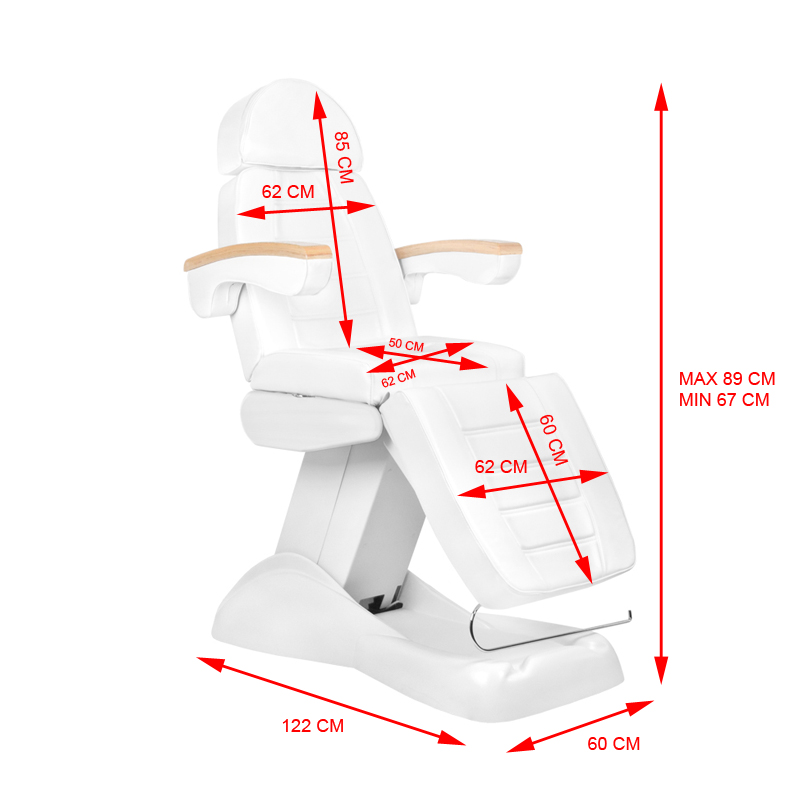 Fotel kosmetyczny, świetnie sprawdza się w gabinetach kosmetycznych i salonach SPA, doskonały do zabiegów kosmetycznych, wizażu i masażu. Posiada elektrycznie sterowane:
