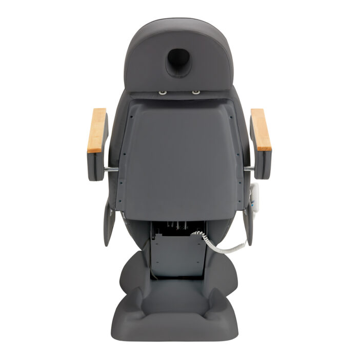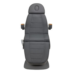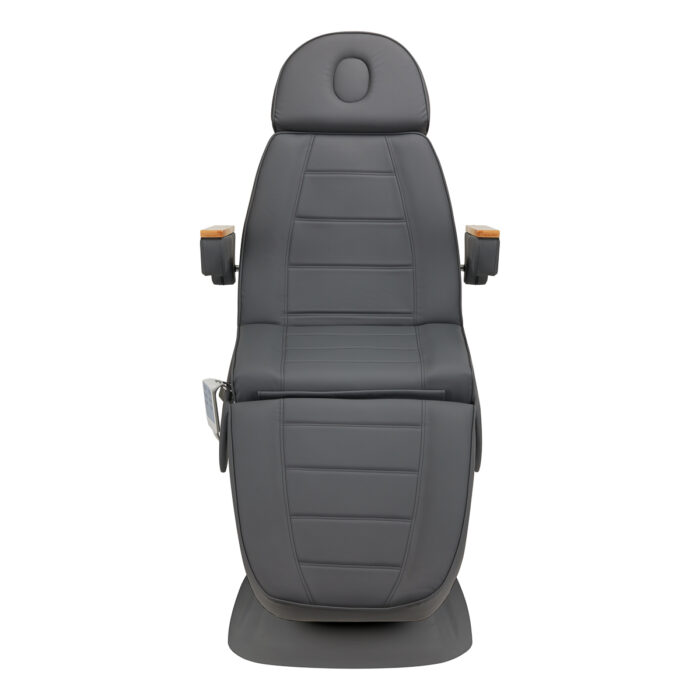 Fotel wypełniony jest pianką o odpowiedniej twardości oraz pokryty przyjemną w dotyku imitacją skóry w odcieniach szarości. Dzięki użyciu materiału, który jest łatwy do utrzymania w czystości oraz odporny na wybrane środki dezynfekcji, sprzęt jest komfortowy w użytkowaniu, wytrzymały na wilgoć oraz nieskomplikowany w czyszczeniu. Solidna podstawa wykonana z trwałego materiału w odcieniach szarości zapewnia stabilność w trakcie zabiegów. Ozdobne drewniane elementy na podłokietnikach wyróżniają fotel pośród innych modeli, stanowiąc atrakcyjny wizualnie, elegancki akcent. Odpowiednio wyprofilowane obszycia nadają fotelowi stylowy wygląd i sprawiają, że siedzisko jest ergonomiczne.