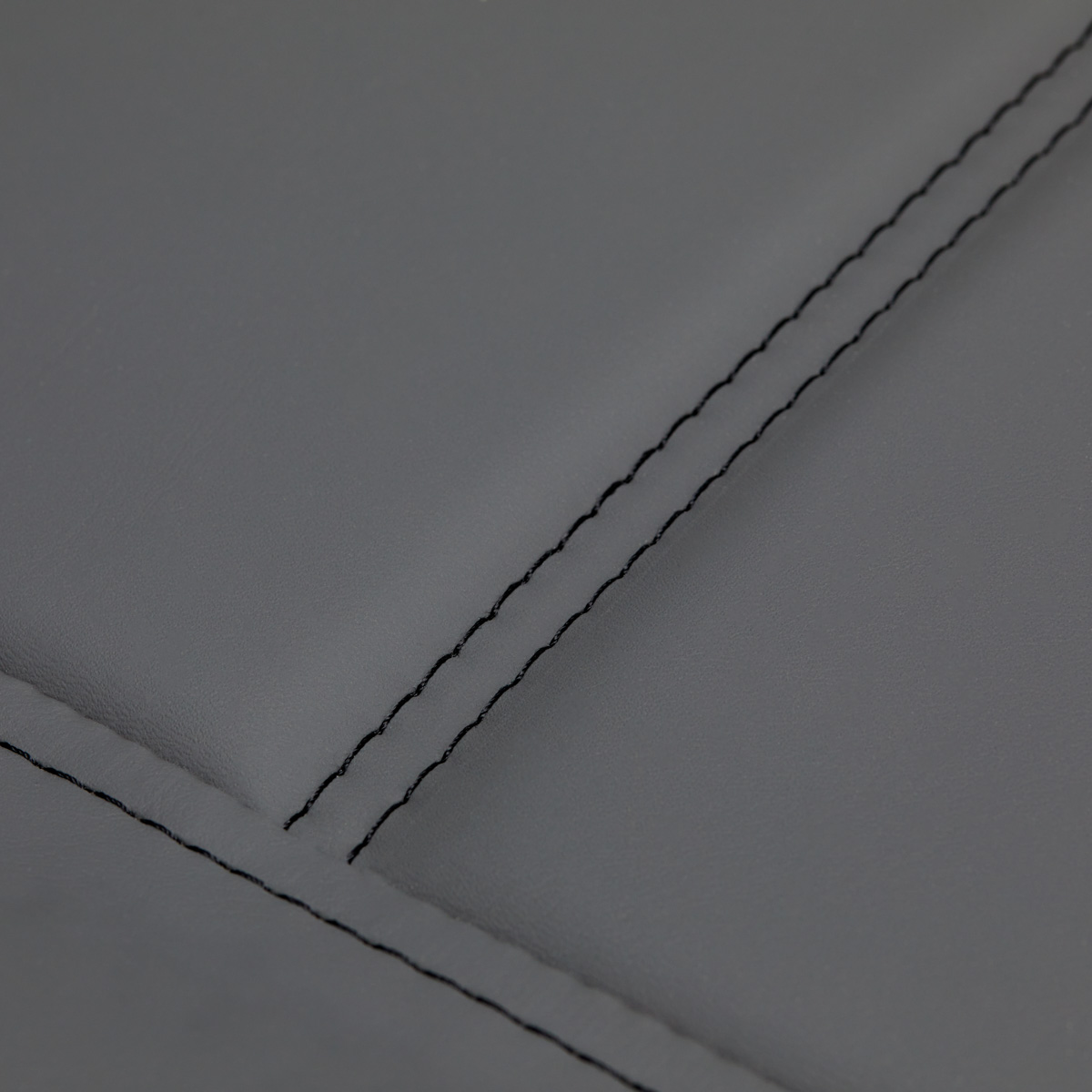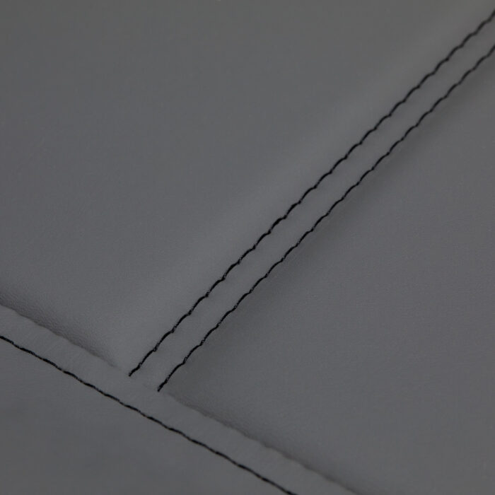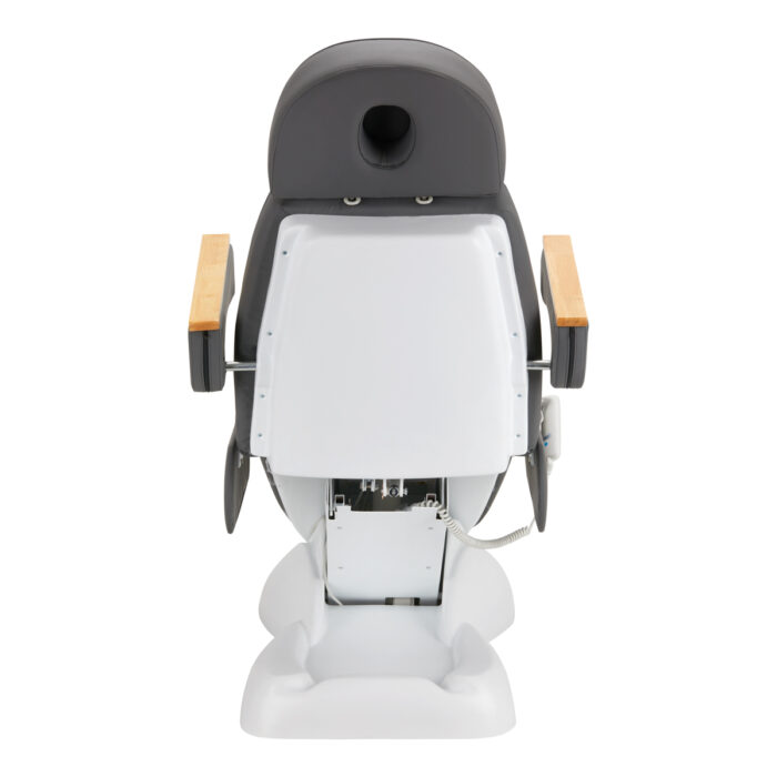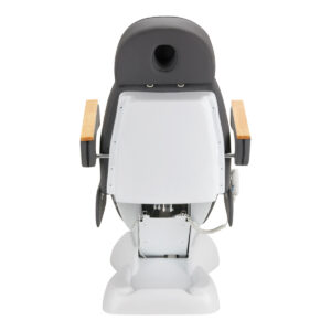 Fotel wypełniony jest pianką o odpowiedniej twardości oraz pokryty przyjemną w dotyku imitacją skóry w odcieniach szarości. Dzięki użyciu materiału, który jest łatwy do utrzymania w czystości oraz odporny na wybrane środki dezynfekcji, sprzęt jest komfortowy w użytkowaniu, wytrzymały na wilgoć oraz nieskomplikowany w czyszczeniu. Solidna podstawa wykonana z trwałego materiału w odcieniach bielizapewnia stabilność w trakcie zabiegów. Ozdobne drewniane elementy na podłokietnikach wyróżniają fotel pośród innych modeli, stanowiąc atrakcyjny wizualnie, elegancki akcent. Odpowiednio wyprofilowane obszycia nadają fotelowi stylowy wygląd i sprawiają, że siedzisko jest ergonomiczne.