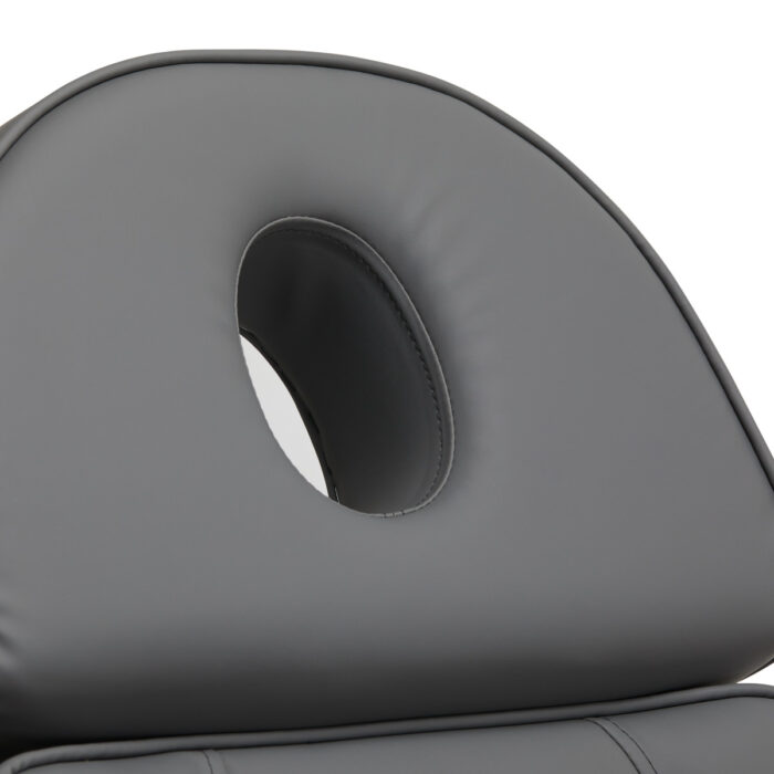 Zagłówek jest wysuwany, co pomaga dostosować sprzęt do potrzeb użytkowników o różnym wzroście, zapewniając stabilne wsparcie głowy w trakcie zabiegów. Ukryty od zaślepką otwór w zagłówku i możliwość swobodnego rozłożenia sprzętu do pozycji leżanki znacząco zwiększa jego funkcjonalność przy usługach na twarz i ciało. Pozwala to na bezproblemowe wykonywanie różnego rodzaju zabiegów, między innymi z zakresu kosmetyki, fizjoterapii czy tatuażu. Zastosowane rozwiązania znacząco poprawiają komfort użytkowania oraz ergonomię pracy.