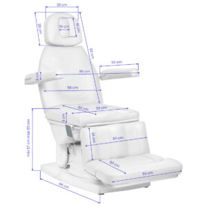 Wygodne ergonomicznie wyprofilowane siedzisko zapewnia wygodne i stabilne ułożenie ciała podczas zabiegów. Konstrukcja umożliwia rozłożenie fotela do pozycji leżanki, a praktyczny otwór w zagłówku, dyskretnie ukryty pod poduszką, sprawia, że doskonale sprawdza się również przy masażach oraz zabiegach na plecy i ciało. Wysuwany zagłówek pozwala dodatkowo dopasować fotel do wzrostu klienta i rodzaju wykonywanego zabiegu. Stabilne podłokietniki zapewniają komfortowe podparcie rąk, a możliwość ich odchylenia do tyłu ułatwia zajmowanie miejsca na fotelu.