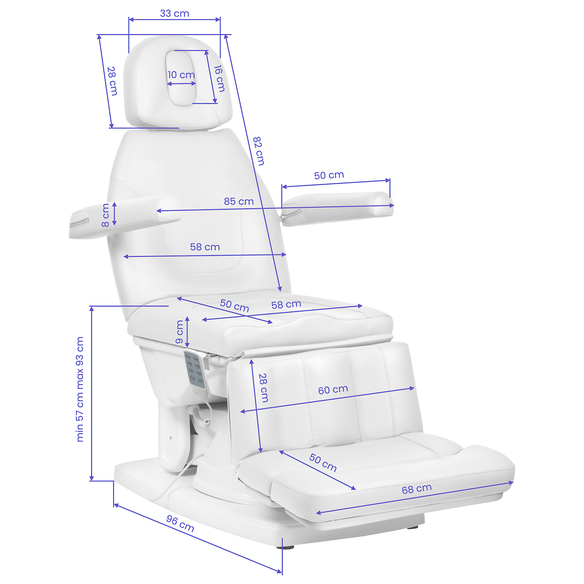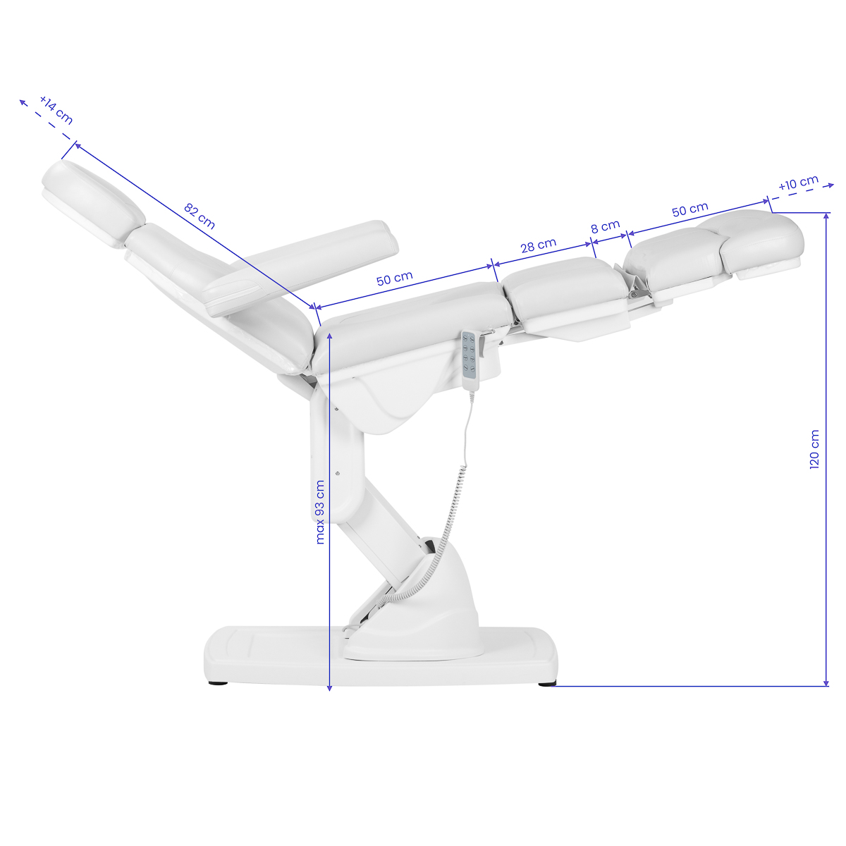Fotel można wygodnie regulować za pomocą intuicyjnego pilota przewodowego, który umożliwia płynne sterowanie w czterech płaszczyznach: wysokości, nachylenia oparcia, kołyski oraz podnóżka. Zakres regulacji wysokości siedziska wynosi od 55 cm do 94 cm, co pozwala na dopasowanie ustawienia do wzrostu specjalisty oraz rodzaju wykonywanego zabiegu. W pełnym rozłożeniu fotel osiąga długość ponad 200 cm, dzięki czemu zapewnia komfort użytkownikom o różnym wzroście. Dla większej wygody pilot można odwiesić na uchwycie przy siedzisku, co zapobiega jego przeszkadzaniu w trakcie pracy. Opcjonalnie dostępna jest możliwość podłączenia przełącznika nożnego (kod 133026).