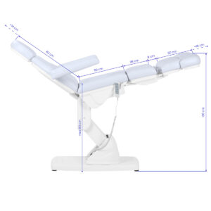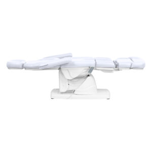 Specjalnie zaprojektowany podnóżek znacząco ułatwia wykonywanie zabiegów pedicure i podologicznych. Jest szeroki i stabilny, a dzięki elektrycznej regulacji pilotem można płynnie ustawiać jego kąt nachylenia. Takie rozwiązanie pozwala na wygodne podparcie nóg oraz ich odpowiednie ułożenie w różnych pozycjach, co zwiększa komfort zarówno klienta, jak i osoby wykonującej zabieg. Możliwość wysunięcia podnóżka sprawia, że fotel doskonale dopasowuje się także do wyższych użytkowników, zapewniając im właściwe podparcie. Dzięki możliwości odczepienia końcowej części podnóżka specjalista zyskuje pełną swobodę dostępu do stóp i palców, większą wygodę oraz precyzję podczas wymagających zabiegów. Przy maksymalnym podniesieniu siedziska, wyprostowanym podnóżku i odchylonej kołysce jego wysokość wynosi około 120 cm, co dodatkowo ułatwia precyzyjną pracę przy specjalistycznych zabiegach podologicznych.