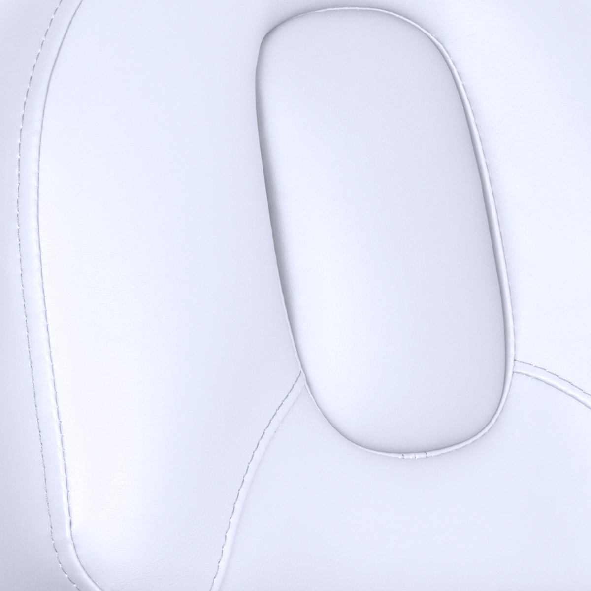 Wygodne ergonomicznie wyprofilowane siedzisko zapewnia wygodne i stabilne ułożenie ciała podczas zabiegów. Konstrukcja umożliwia rozłożenie fotela do pozycji leżanki, a praktyczny otwór w zagłówku, dyskretnie ukryty pod poduszką, sprawia, że doskonale sprawdza się również przy masażach oraz zabiegach na plecy i ciało. Wysuwany zagłówek pozwala dodatkowo dopasować fotel do wzrostu klienta i rodzaju wykonywanego zabiegu. Stabilne podłokietniki zapewniają komfortowe podparcie rąk, a możliwość ich odchylenia do tyłu ułatwia zajmowanie miejsca na fotelu.