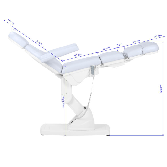 Fotel można wygodnie regulować za pomocą intuicyjnego pilota przewodowego, który umożliwia płynne sterowanie w czterech płaszczyznach: wysokości, nachylenia oparcia, kołyski oraz podnóżka. Zakres regulacji wysokości siedziska wynosi od 55 cm do 94 cm, co pozwala na dopasowanie ustawienia do wzrostu specjalisty oraz rodzaju wykonywanego zabiegu. W pełnym rozłożeniu fotel osiąga długość ponad 200 cm, dzięki czemu zapewnia komfort użytkownikom o różnym wzroście. Dla większej wygody pilot można odwiesić na uchwycie przy siedzisku, co zapobiega jego przeszkadzaniu w trakcie pracy. Opcjonalnie dostępna jest możliwość podłączenia przełącznika nożnego (kod 133026).