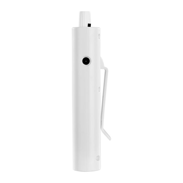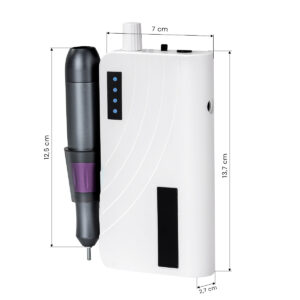 Frezarka jest niewielka, a jej minimalistyczna obudowa z tworzywa sztucznego w odcieniach bieli zapewnia łatwość utrzymania urządzenia w czystości. Dzięki kompaktowym wymiarom i lekkiej wadze, urządzenie łatwo przechowywać w niewielkich przestrzeniach oraz wygodnie transportować, co jest szczególnie ważne dla osób świadczących usługi mobilne. Z tyłu obudowy znajduje się klips, który umożliwia wygodne przypięcie urządzenia do pasa lub innego miejsca.