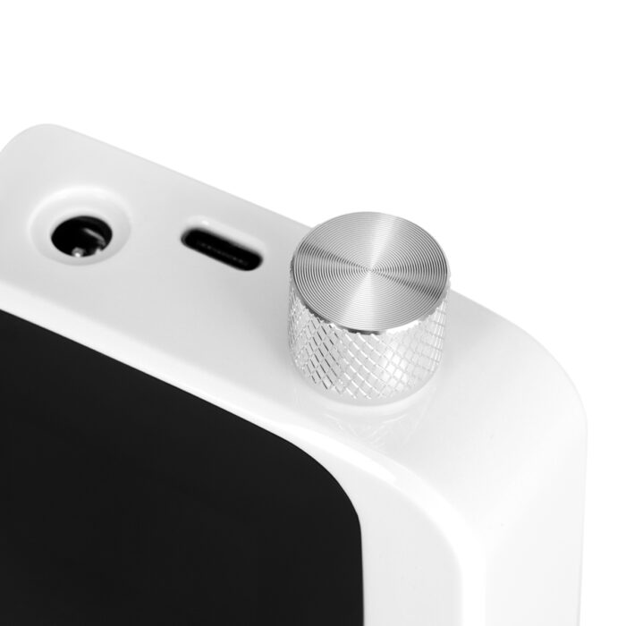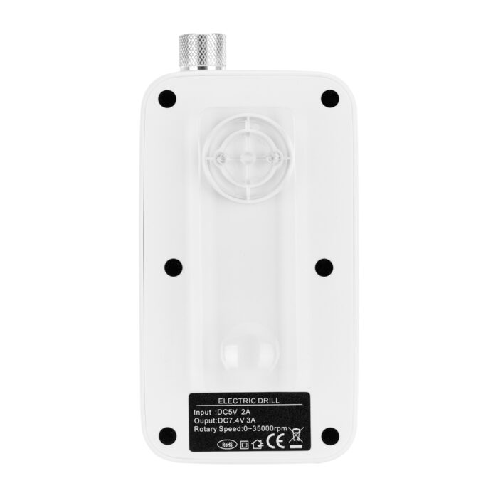 Frezarka jest poręczna i lekka, a jej minimalistyczna obudowa z tworzywa sztucznego w odcieniach bieli zapewnia trwałość oraz łatwość utrzymania urządzenia w czystości. Dzięki kompaktowym wymiarom i niewielkiej wadze, urządzenie można z łatwością przechowywać na małych przestrzeniach oraz wygodnie transportować, co jest szczególnie istotne dla osób świadczących usługi mobilne. Z tyłu obudowy znajduje się klips, który umożliwia wygodne przypięcie urządzenia do pasa lub innego miejsca. Dodatkowo, antypoślizgowe elementy na spodzie urządzenia zapewniają większą stabilność podczas użytkowania.