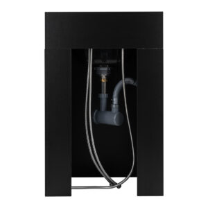 Stacja została wykonana z płyt w odcieniach głębokiej czerni, co nadaje jej elegancki i wyrazisty charakter – doskonale wpisujący się w nowoczesne wnętrza. W komplecie znajduje się armatura w kolorze chromu: bateria, słuchawka prysznicowa oraz elastyczne węże, zapewniające pełną funkcjonalność. Chromowane akcenty doskonale współgrają z matową powierzchnią zabudowy, podkreślając nowoczesny styl i profesjonalne wykończenie mebla.