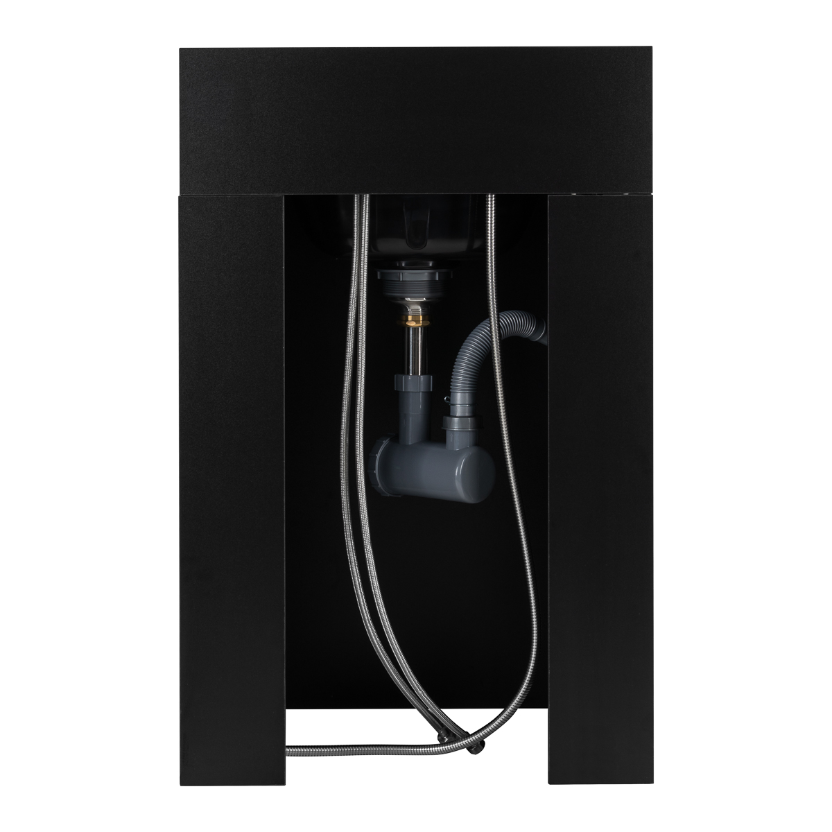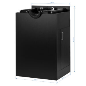 W zabudowie zastosowano boczne drzwiczki, które zapewniają łatwy dostęp do instalacji oraz umożliwiają przechowywanie najpotrzebniejszych produktów w dyskretny sposób. Tylny otwór na przyłącze wody pozwala na wygodne i estetyczne podłączenie stacji, jednocześnie umożliwiając ukrycie rur oraz odpływu, co sprzyja zachowaniu porządku i profesjonalnego wyglądu stanowiska. Kompaktowa forma mebla sprawia, że idealnie sprawdzi się zarówno w dużych salonach, jak i w mniejszych gabinetach.