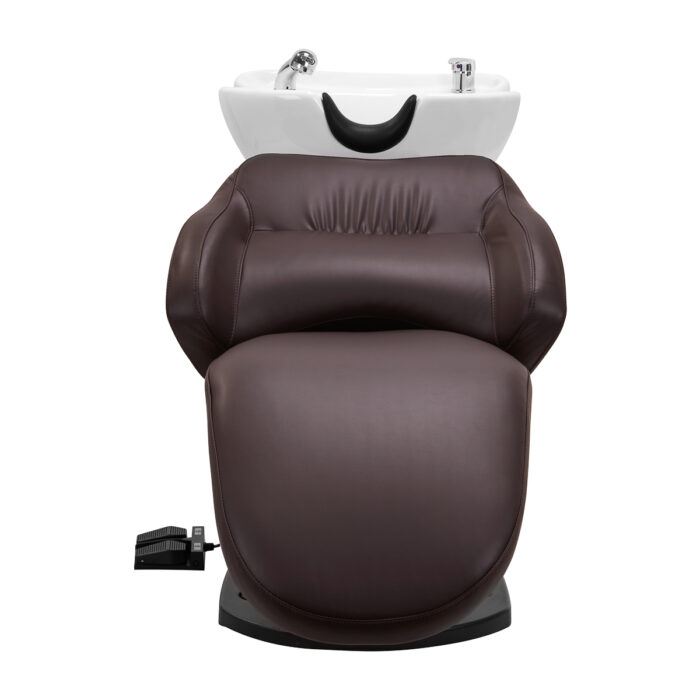 Myjnia fryzjerska Gabbiano TRYCHO została zaprojektowana z myślą o wykonywaniu czasochłonnych zabiegów pielęgnacyjnych czy koloryzacji oraz zapewnieniu klientowi wygodnej pozycji podczas dłuższych procedur. Odpowiednio wyprofilowany fotel wypełniony trwałą pianką zapewnia wysoki komfort użytkowania, a tapicerowane podłokietniki pozwalają na prawidłowe ułożenie barków klienta. Oparcie umieszczone pod optymalnym kątem sprzyja doskonałemu wsparciu kręgosłupa. Pokrycie ze skóry syntetycznej w odcieniach brązgwarantuje wieloletnią wytrzymałość oraz łatwość czyszczenia. Oryginalny, elegancki wygląd myjni nadaje wnętrzom niepowtarzalnego wyrazu. Podstawa dodaje stabilności i subtelnie podkreśla stylowy charakter myjni. W zestawie znajduje się kompletna armatura w odcieniach chromu, w tym bateria, słuchawka prysznicowa oraz dedykowane węże, aby zapewnić całkowity zestaw narzędzi do pracy.