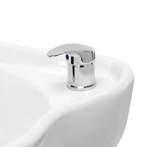 Głębokość ceramicznej misy umywalki w odcieniach bieli pozwala na komfortowe i efektywne wykonywanie szerokiej gamy usług fryzjerskich, zapobiegając nadmiernemu rozchlapywaniu wody oraz używanych w trakcie zabiegu produktów. Zastosowany materiał sprawia, że umywalka jest wytrzymała, odporna na przebarwienia i zadrapania oraz bardzo łatwa do utrzymania w czystości. Odpowiednio wyprofilowany kołnierz zapewnia wygodę w trakcie mycia włosów. Zastosowanie w misie specjalnej podpórki gwarantuje odpowiednie podparcie głowy, dzięki czemu jej ciężar nie spoczywa na szyi. Innowacyjne rozwiązanie zapobiega napięciom i dyskomfortowi w obrębie karku i zapewnia wysoki komfort, nawet w trakcie wykonywania długich zabiegów. Dodatkowo dzięki komfortowej nakładce z tworzywa sztucznego w odcieniach czerni klient nie odczuje nieprzyjemności związanych z chłodem ceramicznej powierzchni.