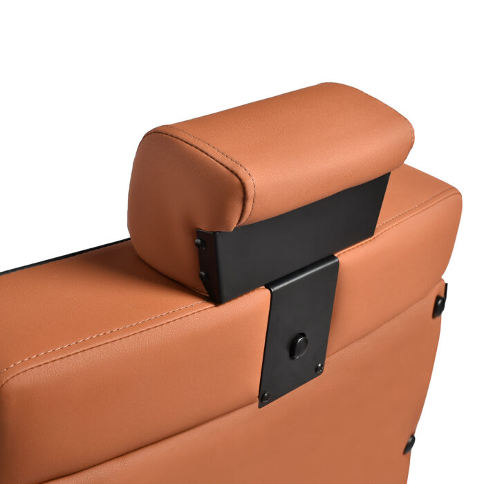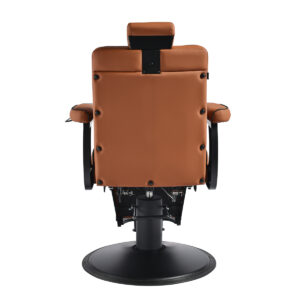 Czarna, okrągła podstawa zapewnia stabilność oraz trwałość użytkowania. Obicie z miękkiej, matowej skóry syntetycznej łączy komfort z wytrzymałością. Zastosowane materiały są odporne na wilgoć, trwałe i łatwe w czyszczeniu. Stylowe przeszycia i tapicerka w odcieniach brązu nadają mu wyjątkowego charakteru, idealnie komponującego się z wystrojem nowoczesnych salonów barberskich. Połączenie eleganckiego odcienia obicia z czarną ramą i podstawą podkreśla nowoczesny, profesjonalny wygląd fotela.