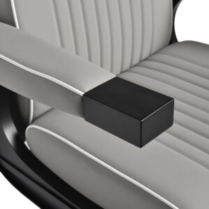 Siedzisko wypełnione miękką pianką zapewnia komfort nawet podczas długich zabiegów, a ergonomicznie wyprofilowane oparcie wspiera plecy. Mechanizm pełnego obrotu zwiększa swobodę ruchów umożliwia swobodny dostęp z każdej strony, usprawniając pracę stylisty. Tapicerowane podłokietniki, osadzone na optymalnej wysokości, wspierają naturalne ułożenie ramion, zmniejszając napięcia barków i karku. Dodatkowym udogodnieniem jest praktyczny uchwyt na ręcznik umieszczony pod lewym podłokietnikiem, ułatwiający organizację pracy.