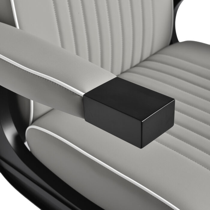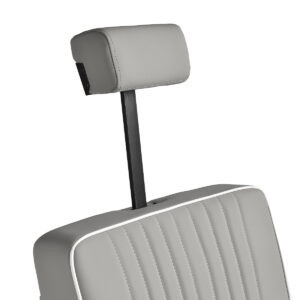 Czarna, okrągła podstawa zapewnia stabilność oraz trwałość użytkowania. Obicie z miękkiej, matowej skóry syntetycznej łączy komfort z wytrzymałością. Zastosowane materiały są odporne na wilgoć, trwałe i łatwe w czyszczeniu. Stylowe przeszycia i tapicerka w odcieniach szarości nadają mu wyjątkowego charakteru, idealnie komponującego się z wystrojem nowoczesnych salonów barberskich. Połączenie eleganckiego odcienia obicia z czarną ramą i podstawą podkreśla nowoczesny, profesjonalny wygląd fotela.
