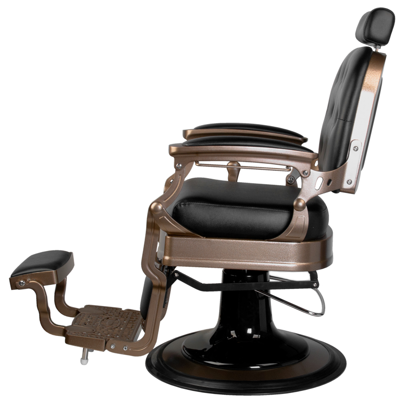 Solidna konstrukcja podstawy zapewnia stabilność oraz wysoki komfort użytkowania. Siedzisko wypełnione trwałą, odporną na odkształcenia pianką oraz obite przyjemną w dotyku skórą syntetyczną odporną na ścieranie i łatwą w pielęgnacji zapewnia trwałość mebla oraz wygodę na najwyższym poziomie. Zastosowane materiały sprawiają, że fotel jest odporny na wilgoć, wytrzymały i łatwy do czyszczenia. Stylowe obicie w odcieniach czerni, ozdobne pikowanie z guzikami na oparciu oraz elegancki podnóżek nadają fotelowi wyjątkowego charakteru. Jego design, inspirowany stylem vintage, doskonale wpisuje się w klimat klasycznych salonów barberskich, podkreślając ich niepowtarzalną atmosferę. Dopracowane detale, oryginalna tekstura tapicerki i masywna podstawa zapewniają nie tylko estetykę, ale także maksymalną stabilność. To połączenie elegancji i funkcjonalności, które spełni oczekiwania nawet najbardziej wymagających profesjonalistów.