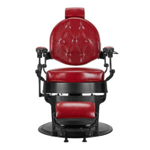 Solidna konstrukcja podstawy zapewnia stabilność oraz wysoki komfort użytkowania. Wypełnienie siedziska z trwałej, odpornej na odkształcenia pianki oraz obicie wykonane z przyjemnej w dotyku skóry syntetycznej o błyszczącym wykończeniu zapewniają trwałość mebla i jego komfortowe użytkowanie przez długi czas. Sprawiają również, że sprzęt jest odporny na wilgoć, wytrzymały oraz łatwy do czyszczenia. Pokrycie w odcieniach czerwieni z pikowaniem i ozdobnymi guzikami nadaje mu wyjątkowego charakteru. Fotel o charakterystycznym designie, nawiązującym do stylu vintage, doskonale wpasowuje się w klimat salonów barberskich, podkreślając ich wyjątkową atmosferę.