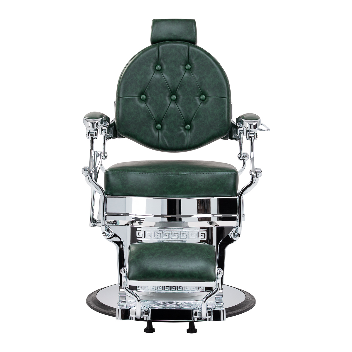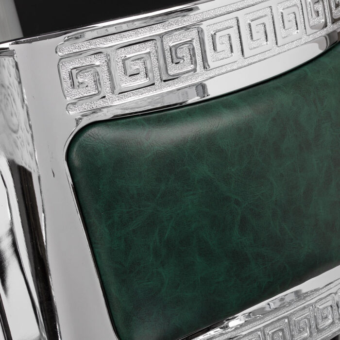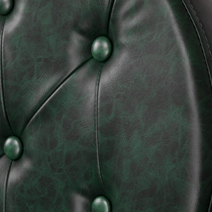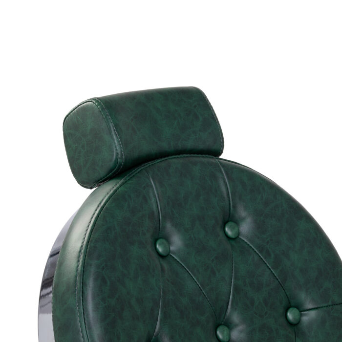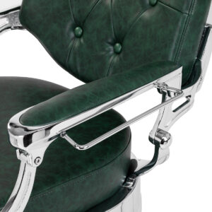 Solidna konstrukcja podstawy zapewnia stabilność oraz wysoki komfort użytkowania. Wypełnienie siedziska z trwałej, odpornej na odkształcenia pianki oraz obicie wykonane z przyjemnej w dotyku skóry syntetycznej o półmatowym wykończeniu zapewniają trwałość mebla i jego komfortowe użytkowanie przez długi czas. Sprawiają również, że sprzęt jest odporny na wilgoć, wytrzymały oraz łatwy do czyszczenia. Pokrycie w odcieniach zieleni z pikowaniem i ozdobnymi guzikami nadaje mu wyjątkowego charakteru. Fotel o charakterystycznym designie, nawiązującym do stylu vintage, doskonale wpasowuje się w klimat salonów barberskich, podkreślając ich wyjątkową atmosferę.