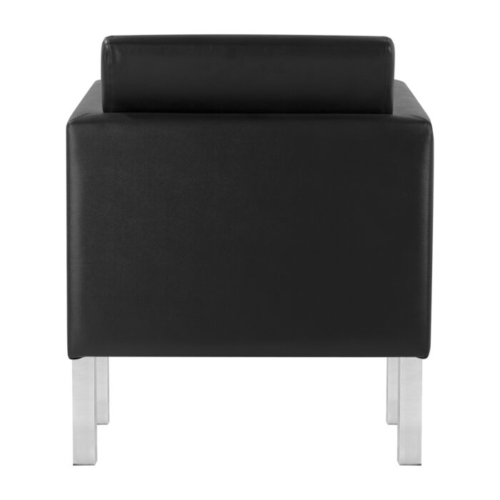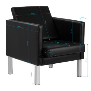 Fotel wykonany jest z trwałej, syntetycznej skóry w klasycznym, czarnym kolorze. Syntetyczna skóra jest łatwa do utrzymania w czystości, co pozwala na zachowanie idealnego wyglądu mebla przez długi czas. Dzięki wysokim nóżkom ułatwia utrzymanie porządku w salonie, umożliwiając łatwe sprzątanie przestrzeni pod nim.