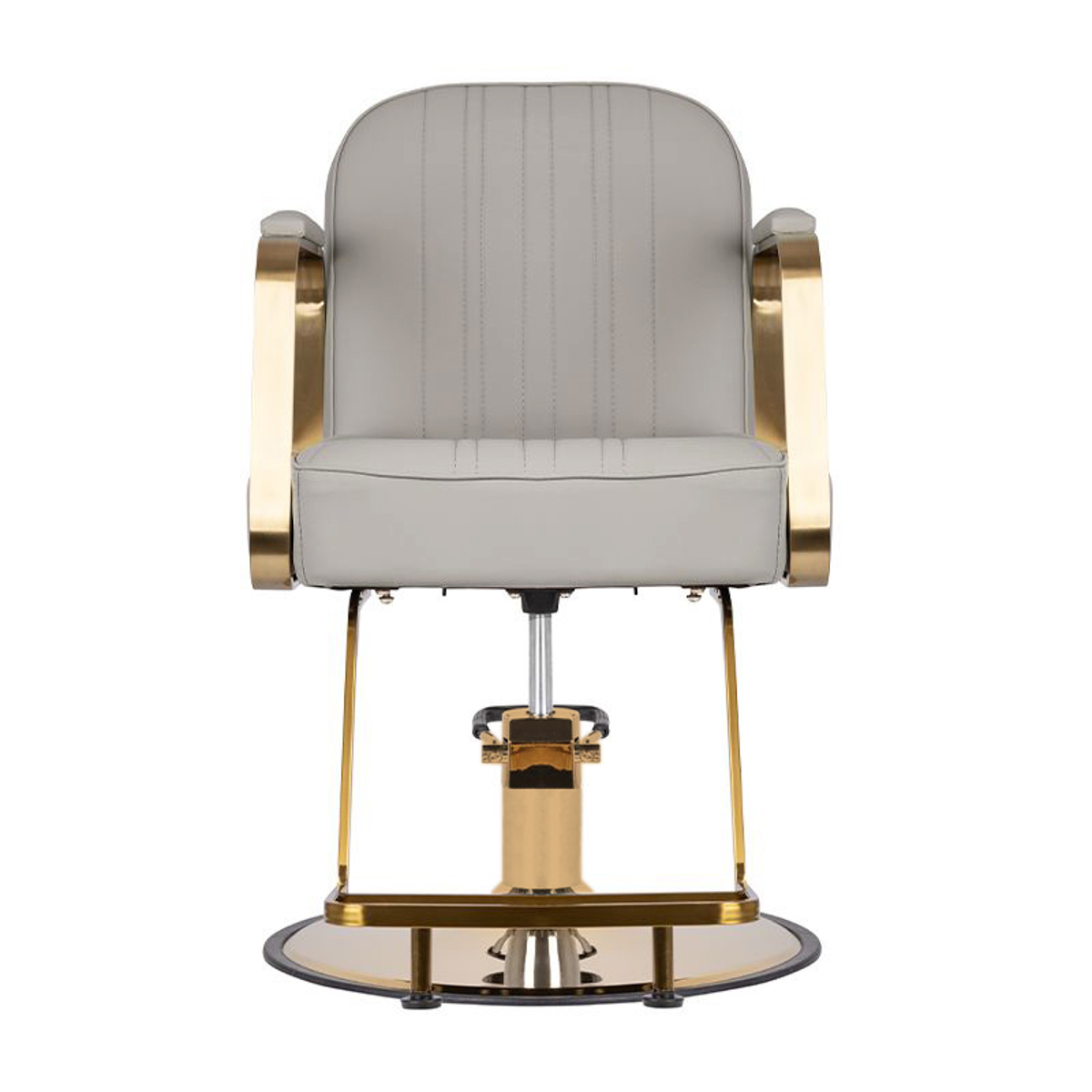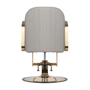 Bardzo komfortowy, idealnie pasujący do wnętrz eleganckich salonów. Regulowany w płaszczyźnie pionowej. Bardzo stabilny i solidny. Obicie z najwyższej jakości ekoskóry koloru beżowego. Dopełnieniem elegancji tego fotela jest złote wykończenie elementów metalowych.