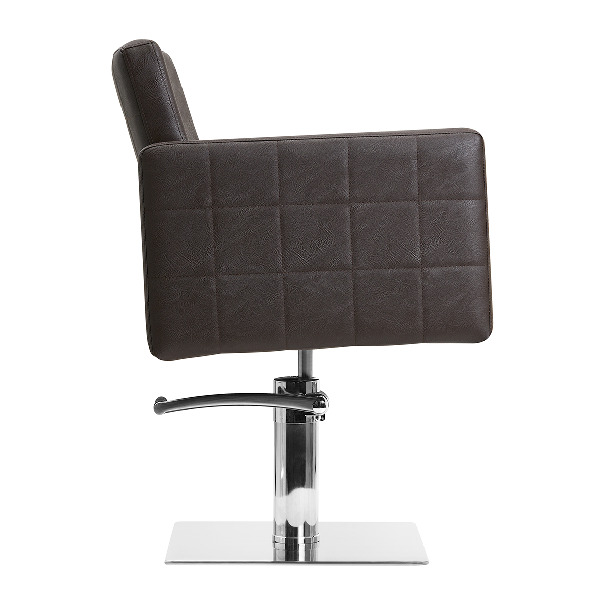 Solidna, płaska podstawa w kształcie kwadratu zapewnia stabilność w trakcie użytkowania. Gładka powierzchnia o lustrzanym wykończeniu nadaje elementowi elegancki wygląd i sprawia, że ten jest łatwy do utrzymania w czystości. Wygodne siedzisko wypełnione trwałą pianką zapewnia wysoki komfort użytkowania, nawet podczas wielogodzinnych zabiegów. Obite skórą syntetyczną podłokietniki z ozdobnymi przeszyciami są ciekawym wizualnie elementem, a co ważniejsze, pozwalają na prawidłowe ułożenie barków klienta. Sprawia to, że nie chowa on głowy w ramionach ani się nie garbi – wyraźnie ułatwia to wykonywanie precyzyjnych zabiegów, w tym strzyżenia. Wyposażenie fotela w mechanizm pełnego obrotu sprawia, że praca fryzjera staje się bardziej efektywna i wygodna.