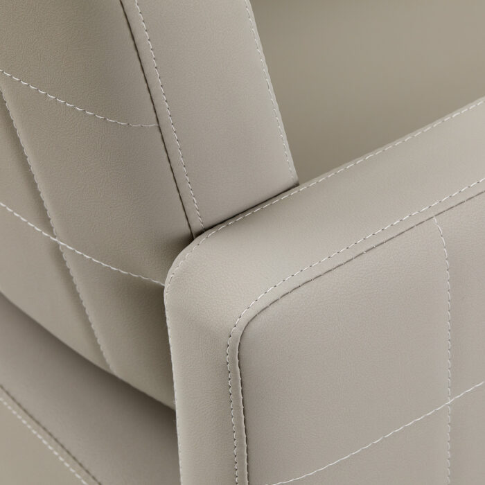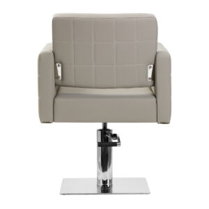 Solidna, płaska podstawa w kształcie kwadratu zapewnia stabilność w trakcie użytkowania. Gładka powierzchnia o lustrzanym wykończeniu nadaje elementowi elegancki wygląd i sprawia, że ten jest łatwy do utrzymania w czystości. Wygodne siedzisko wypełnione trwałą pianką zapewnia wysoki komfort użytkowania, nawet podczas wielogodzinnych zabiegów. Obite skórą syntetyczną podłokietniki z ozdobnymi przeszyciami są ciekawym wizualnie elementem, a co ważniejsze, pozwalają na prawidłowe ułożenie barków klienta. Sprawia to, że nie chowa on głowy w ramionach ani się nie garbi – wyraźnie ułatwia to wykonywanie precyzyjnych zabiegów, w tym strzyżenia. Wyposażenie fotela w mechanizm pełnego obrotu sprawia, że praca fryzjera staje się bardziej efektywna i wygodna.