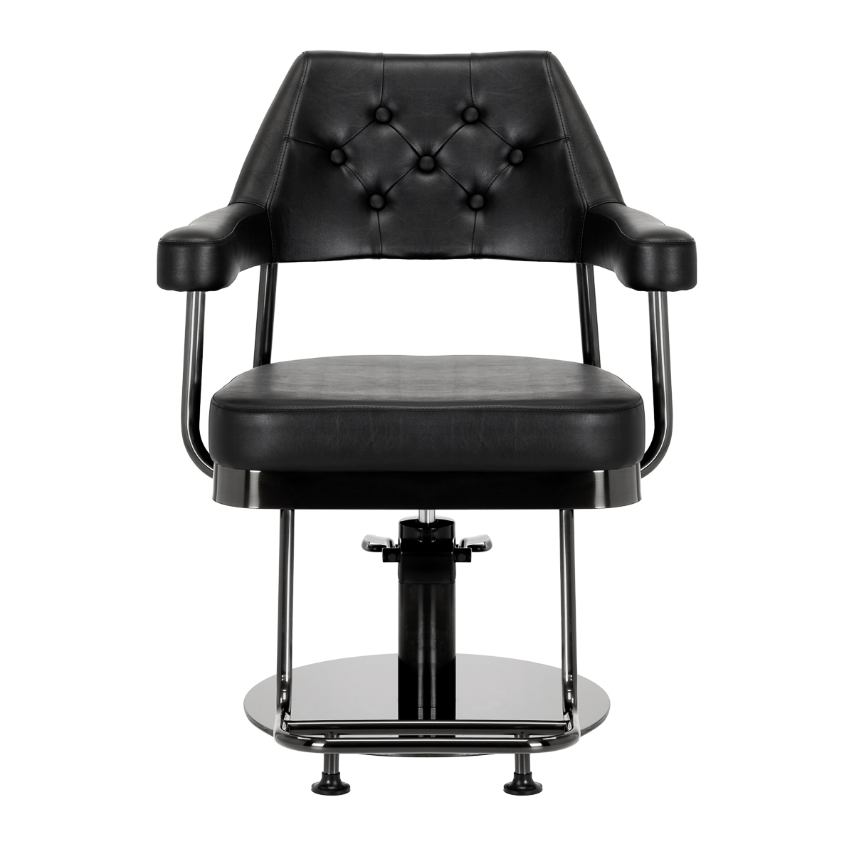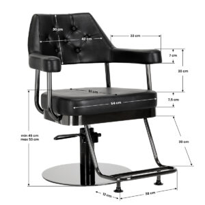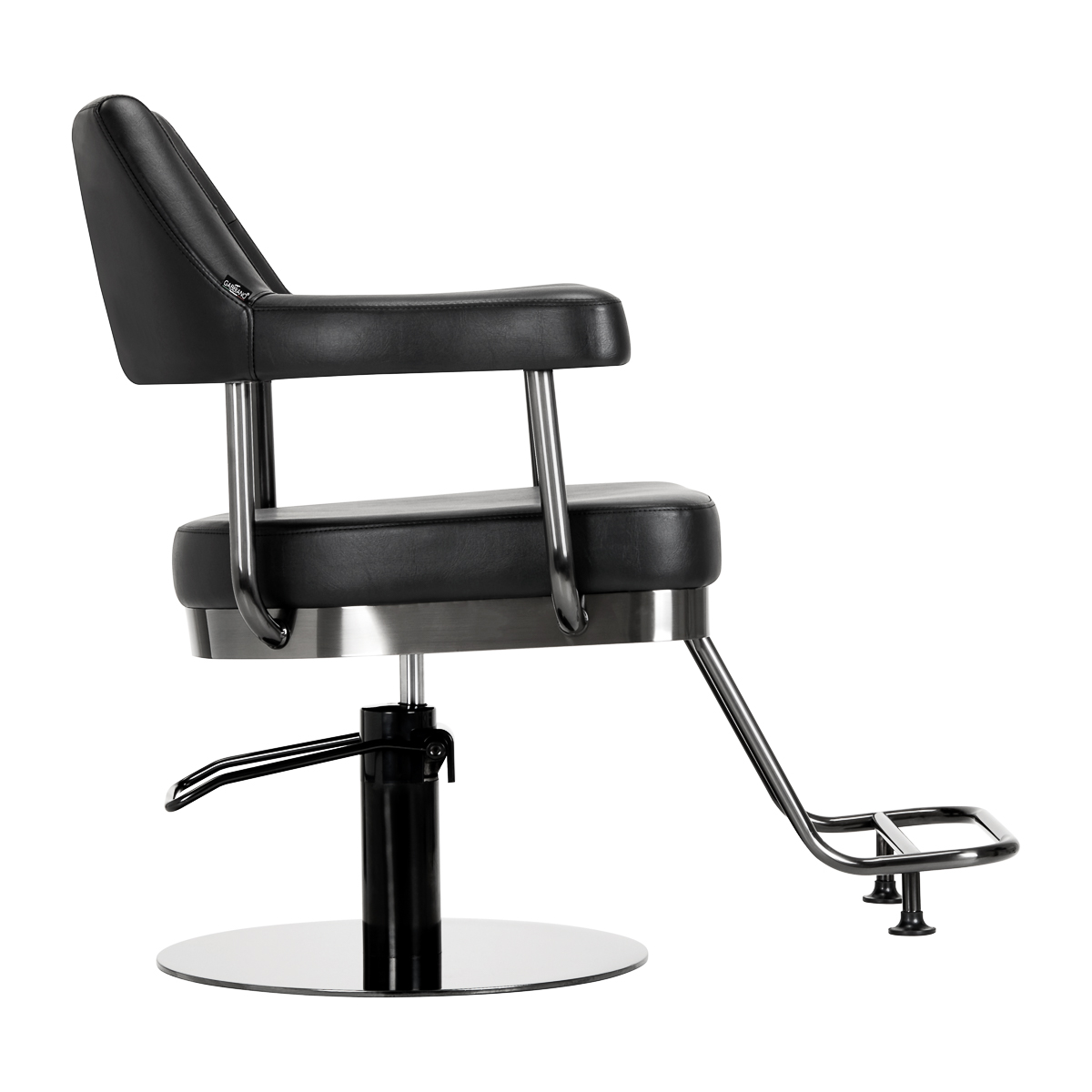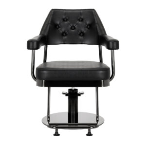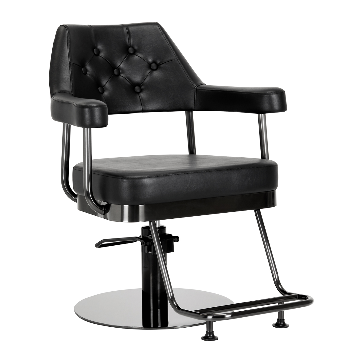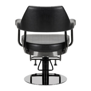 Solidna, okrągła podstawa gwarantuje stabilność w trakcie użytkowania. Gładka powierzchnia o lustrzanym wykończeniu sprawia, że element ten jest łatwy do utrzymania w czystości. Szerokie siedzisko, wypełnione pianką o odpowiedniej twardości, zapewnia wysoki komfort użytkowania i wygodę nawet podczas wielogodzinnych zabiegów. Znacznym plusem jest dedykowany do tego modelu podnóżek, który zapewnia stabilne oparcie dla stóp użytkownika. Podłokietniki znajdują się na odpowiedniej wysokości, dzięki czemu pozwalają na prawidłowe ułożenie barków klienta – sprawia to, że nie chowa głowy w ramionach ani się nie garbi – wyraźnie usprawniając zabiegi, w tym strzyżenie. Ułatwia to precyzyjne wykonywanie usług.
